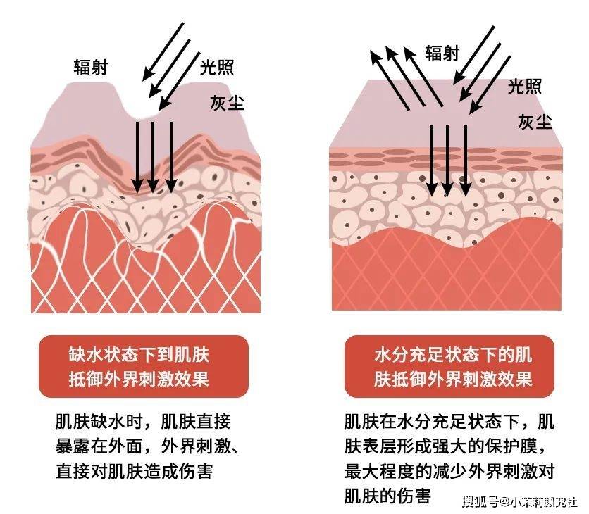简单来说就是角质层缺水。当角质层的含水量低于10%,会引起角质代谢异常,皮肤出现干燥、紧绷、粗糙及角质细胞异常脱落(脱皮)等情况。