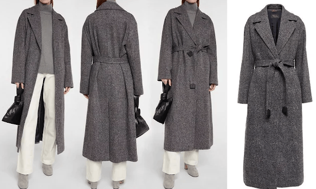 夏琳王妃身穿灰色大衣,羊绒的面料厚实且充满了质感,搭配比大衣短上一截的连衣裙,整体穿搭十分干练。夏琳王妃在脖子处围了一条黑色围巾,自带光泽度的缎面丰富了色彩与层次感,而且与夏琳王妃脚踩着的那双高跟鞋颜色相得益彰。
